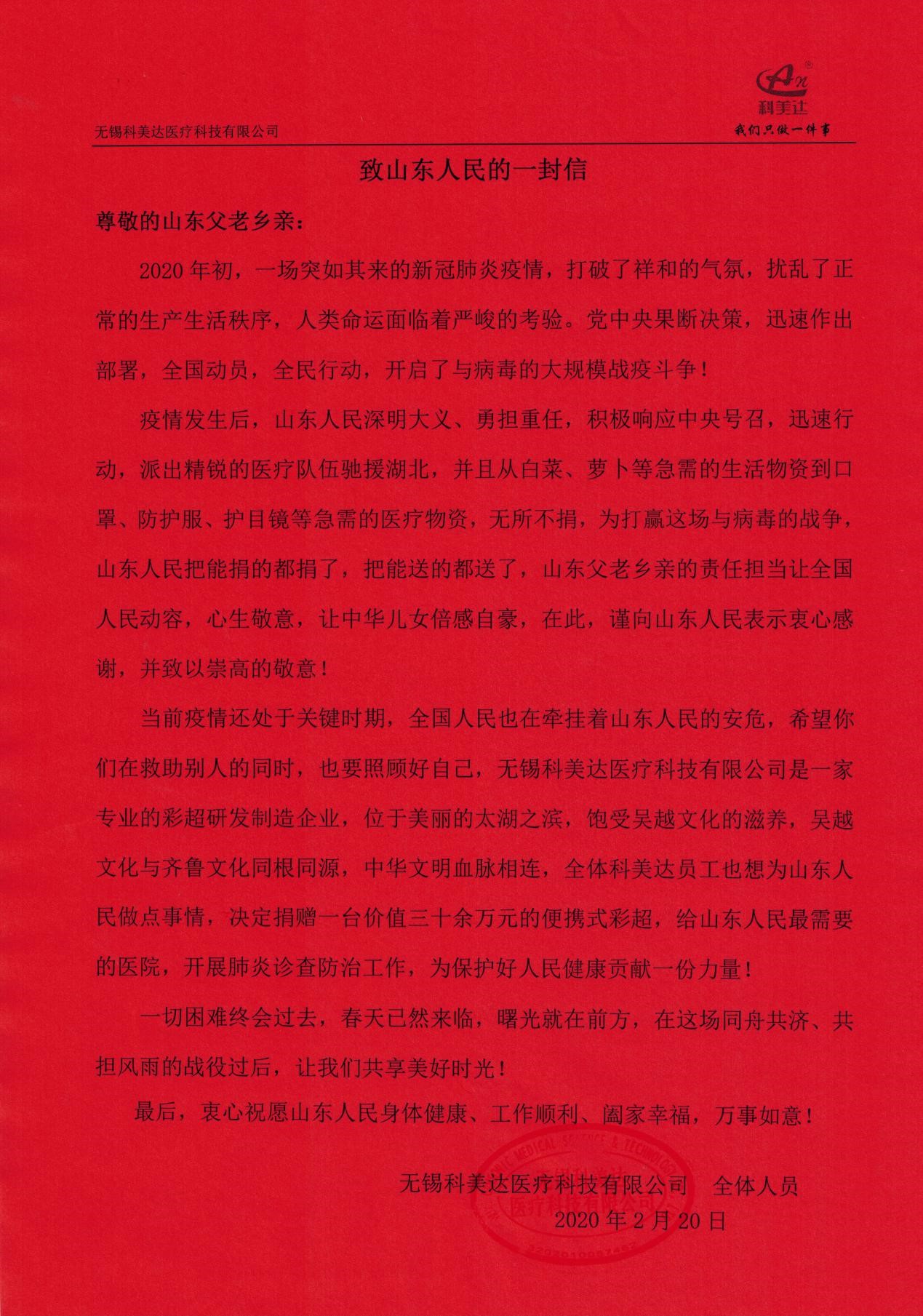 庚子年初,新冠肺炎疫情洶涌而來(lái),隨著鐘南山院士馳援武漢指出新冠肺炎存在“人傳人”的現(xiàn)象,一場(chǎng)史無(wú)前例的疫情攻堅(jiān)戰(zhàn)在全國(guó)打響。武漢告急,全國(guó)馳援,從生活物資到醫(yī)療用品源源不斷往最需要的地方,山東人民搬家式的支援抗疫模式更是感動(dòng)了全國(guó)人民,彩超作為新冠肺炎病情診斷的重要手段,得到臨床專(zhuān)家的重視,為緩解疫情防控期間醫(yī)療物資緊缺狀況,有效防范醫(yī)護(hù)人員感染和疫情擴(kuò)散風(fēng)險(xiǎn),科美達(dá)公司主動(dòng)聯(lián)系山東省慈善機(jī)構(gòu),向濟(jì)南市鋼城區(qū)慈善總會(huì)定向捐贈(zèng)了價(jià)值38萬(wàn)元的便攜式彩超設(shè)備,用于濟(jì)南市鋼城區(qū)醫(yī)院抗擊肺炎疫情和人民健康檢查,確保戰(zhàn)略后方穩(wěn)固。